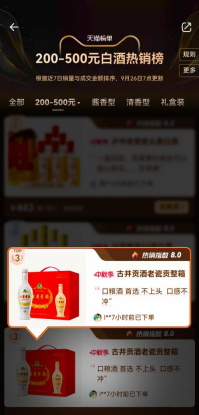 在刚结束的2025年天猫中秋团圆季大促活动,古井贡酒老瓷贡连续上榜中秋热卖榜单TOP1、200-500元热销榜单TOP3 ,同时借助天猫古井贡酒超级品牌日资源的加持,掀起光瓶酒的囤货热潮。