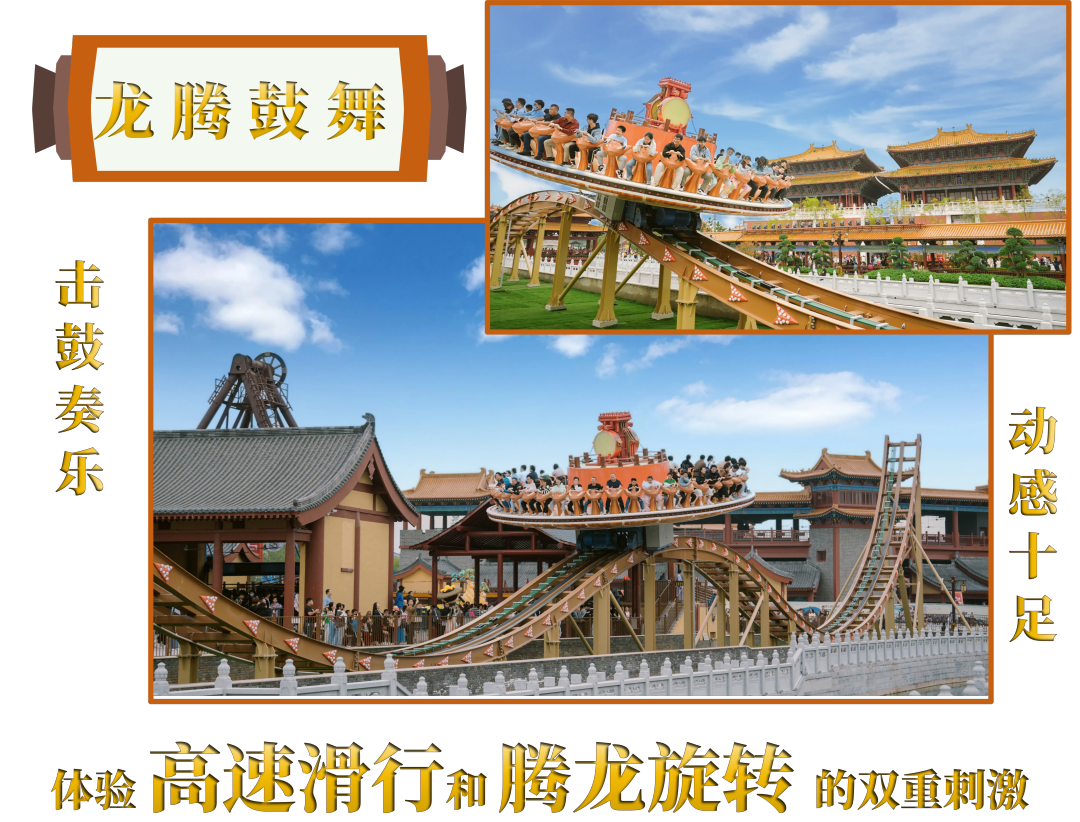 “龙腾鼓舞”游乐设施,增加了宋代击鼓元素,伴随音乐节奏,动感十足,让游客拥有腾云驾雾的沉浸体验。