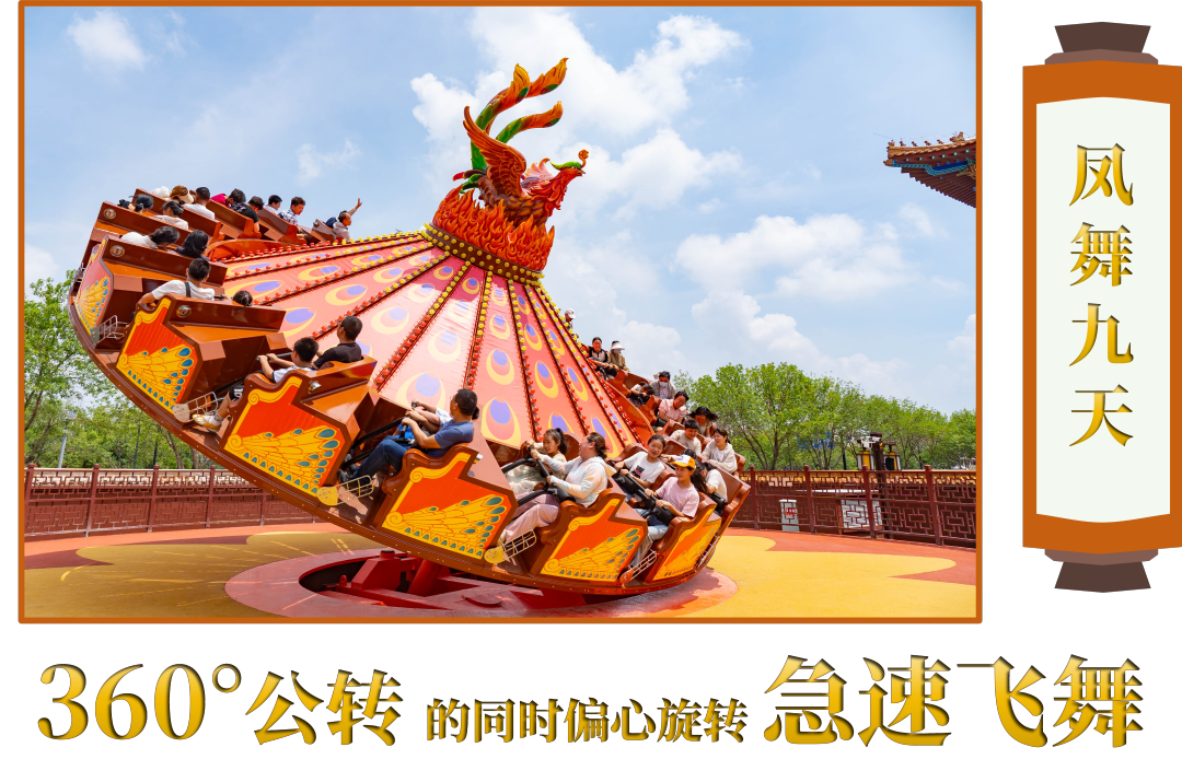 “凤舞九天”游乐项目,座舱在360°公转的同时又有规律的偏心旋转,让游客拥有如凤凰飞翔般的非凡体验。